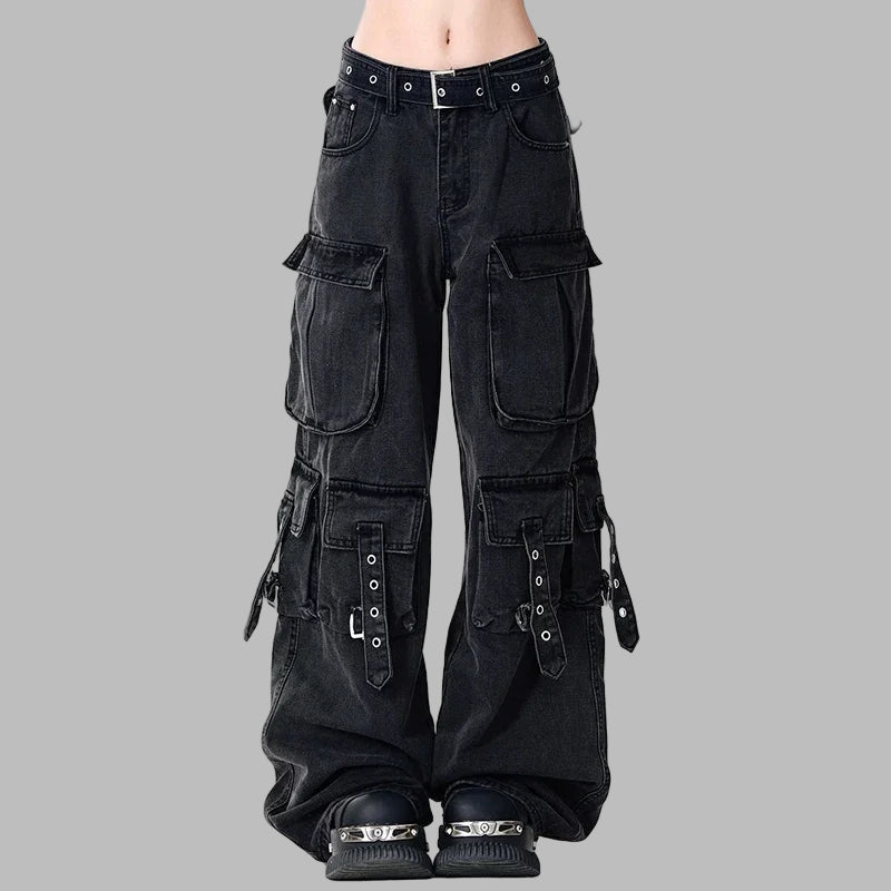 Pantaloni cargo negri gotici cu buzunare, bretele și catarame