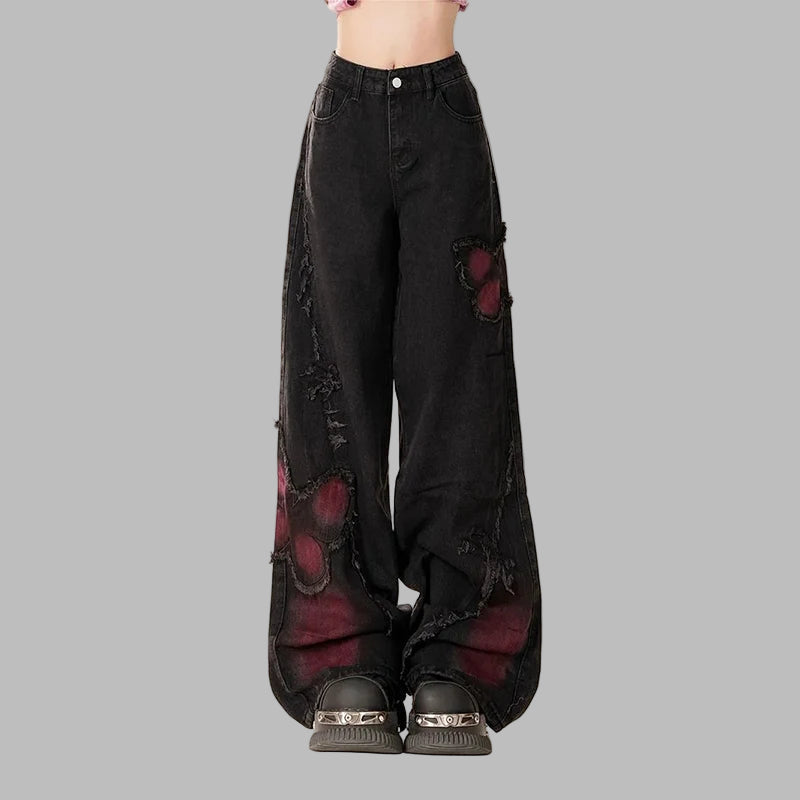 Pantaloni largi din denim, stil gotic grunge punk, rupți, cu inserții roșii