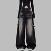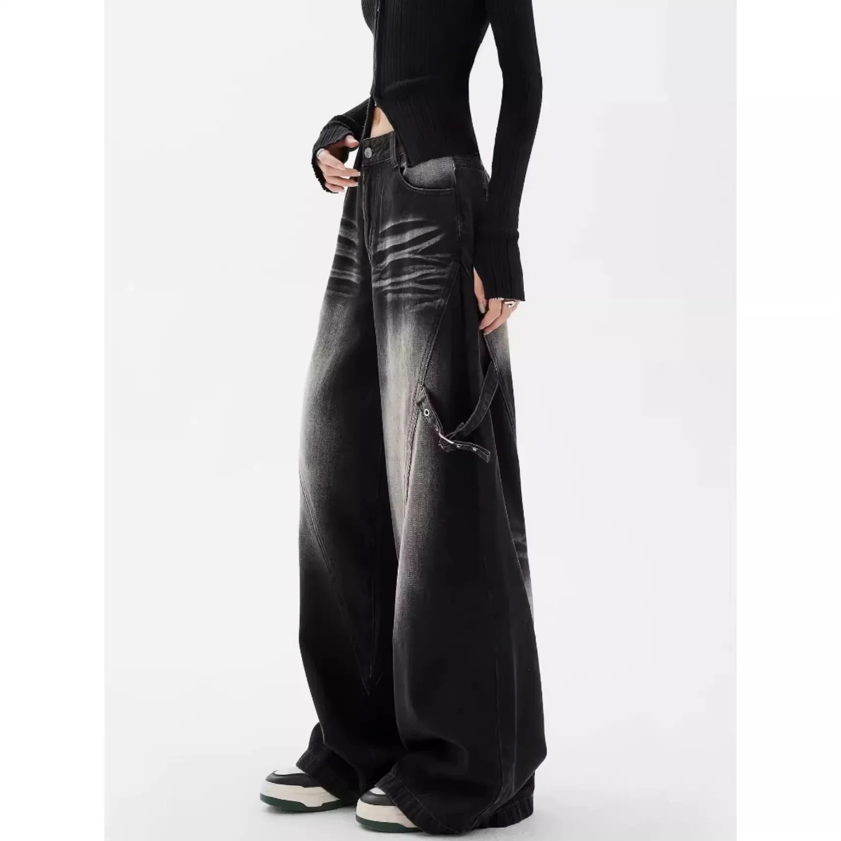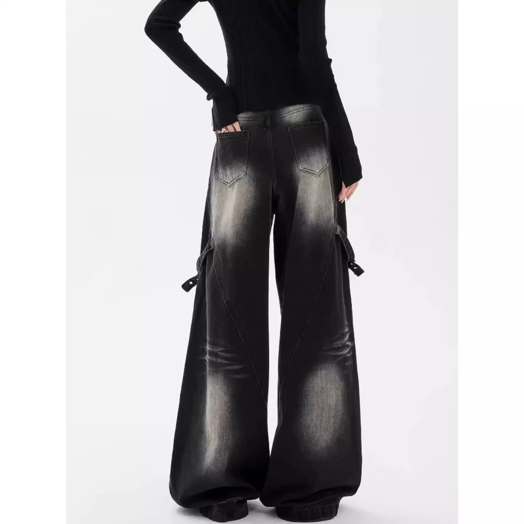 Pantaloni jeans negri evazați cu aspect uzat și catarame, stil grunge, pentru femei Vezi opțiunile