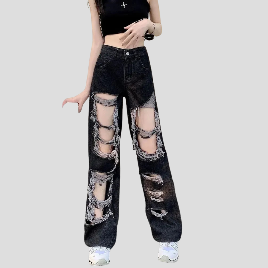 Pantaloni damă largi din denim, stil grunge punk, cu tivuri sfâșiate