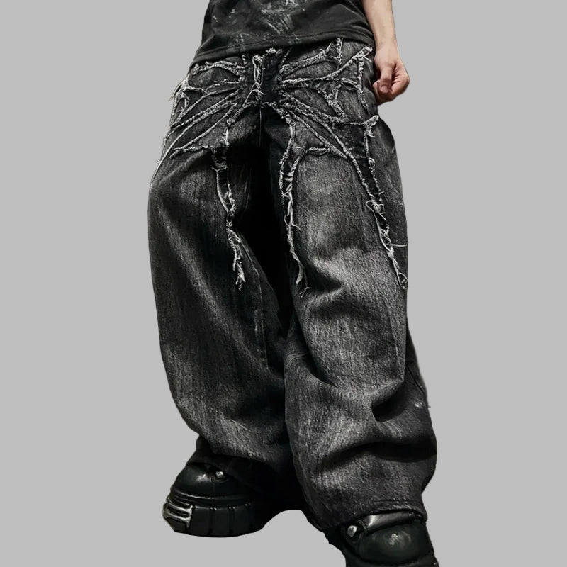 Pantaloni baggy din denim gri, rupți, cu lanțuri, stil punk metal, unisex