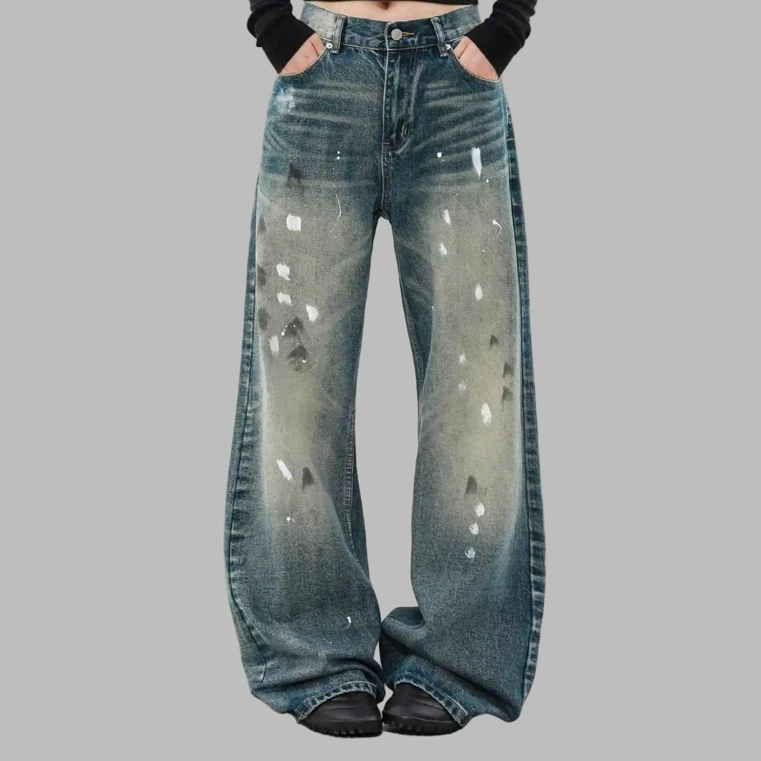 Blugi damă largi, albastre, cu efect uzat și stropi, stil grunge
