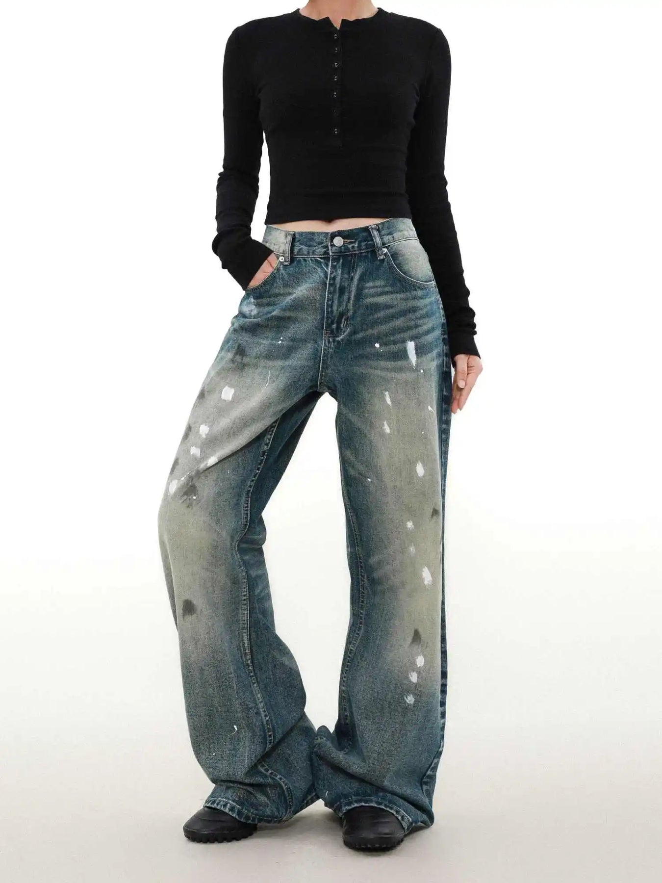 Blugi damă largi, albastre, cu efect uzat și stropi, stil grunge Vezi opțiunile