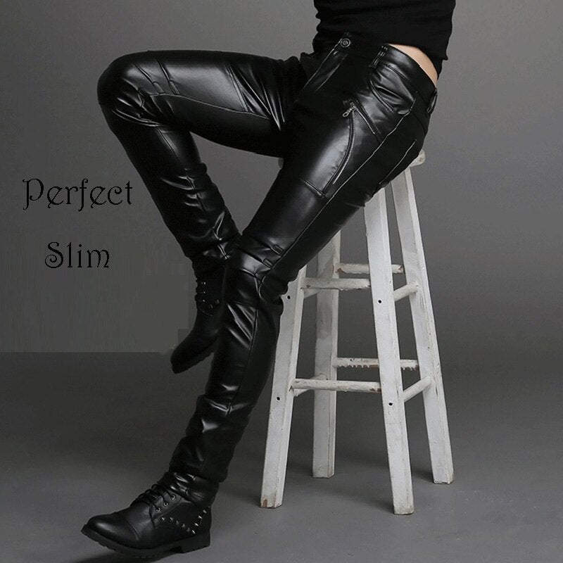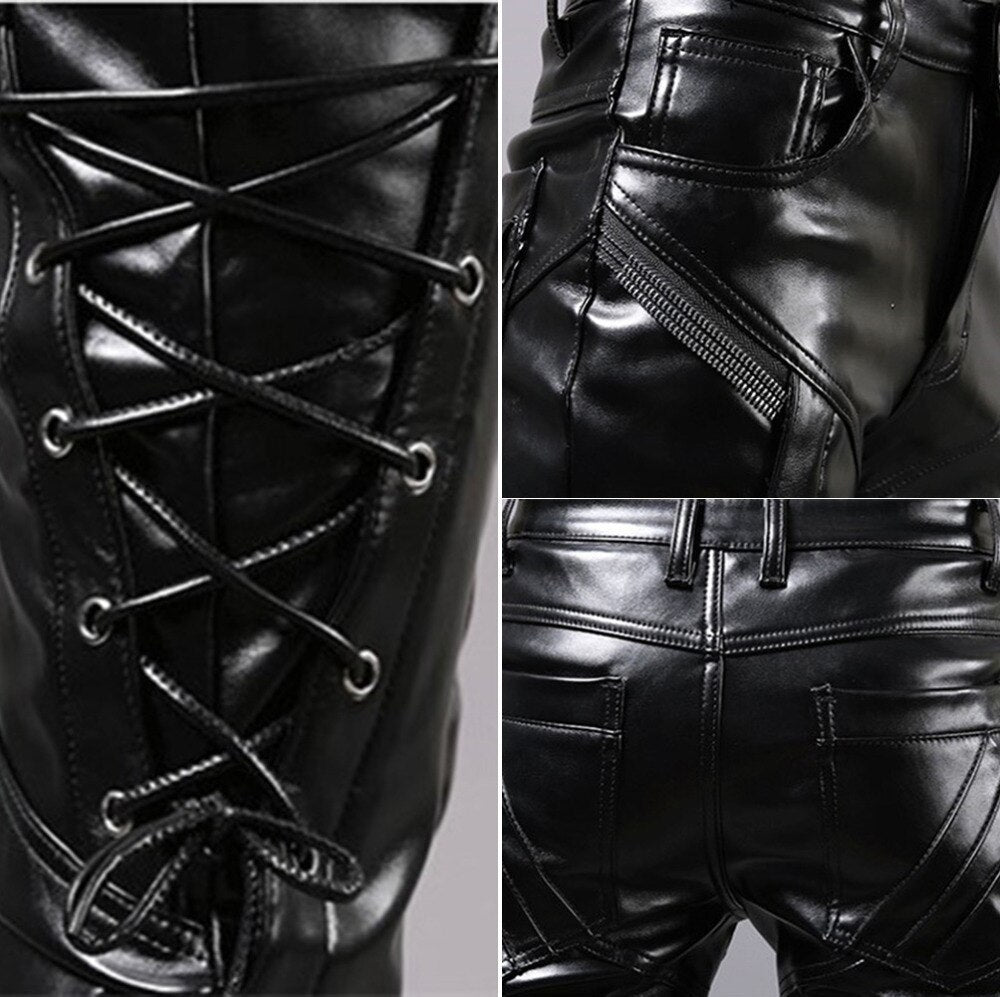 Pantaloni bărbătești din piele, negri, stil rock/metal, ușori