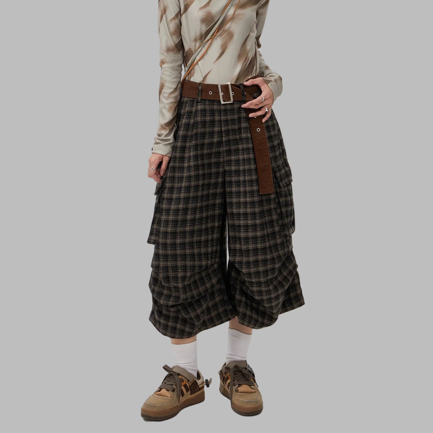 Pantaloni steampunk vintage în carouri khaki cu curea