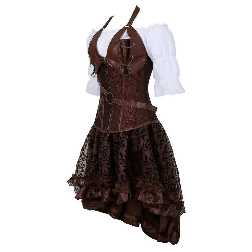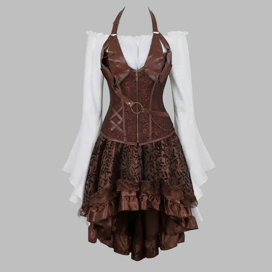 Rochie steampunk maro cu corset și mâneci albe Vezi opțiunile