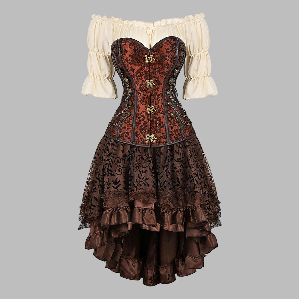 Rochie steampunk cu corset din brocart și fustă cu volane Vezi opțiunile