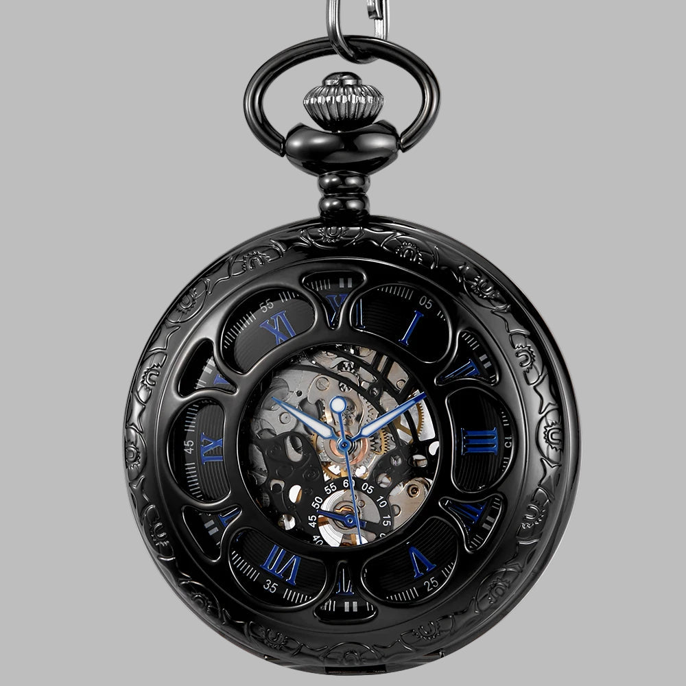 Ceas de buzunar steampunk negru, mecanic, cu accente albastre Vezi opțiunile