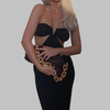 • Detalii senzuale: Bretelele subțiri tip spaghete, decolteul fără bretele și decupajele adaugă o notă de seducție și originalitate acestei rochii, creând un echilibru armonios între senzualitate și eleganță.