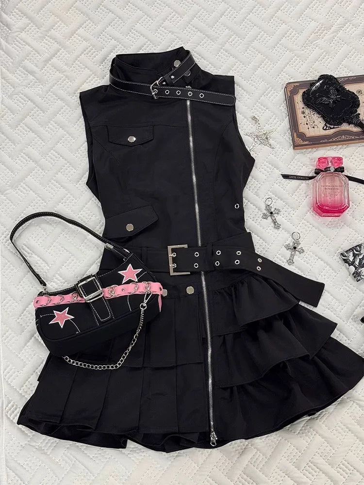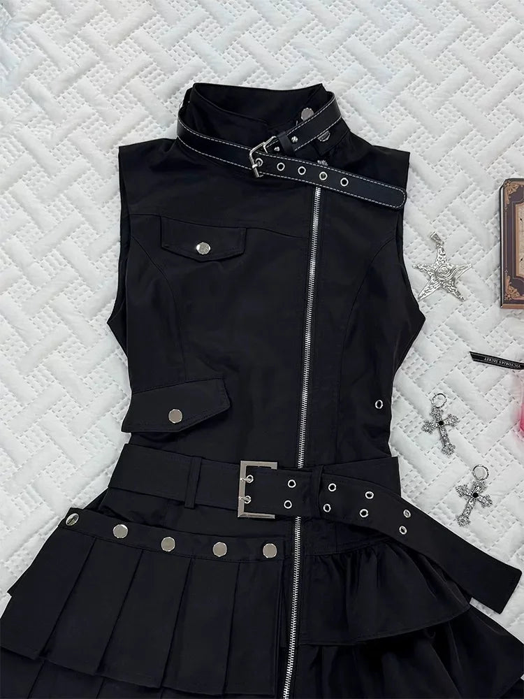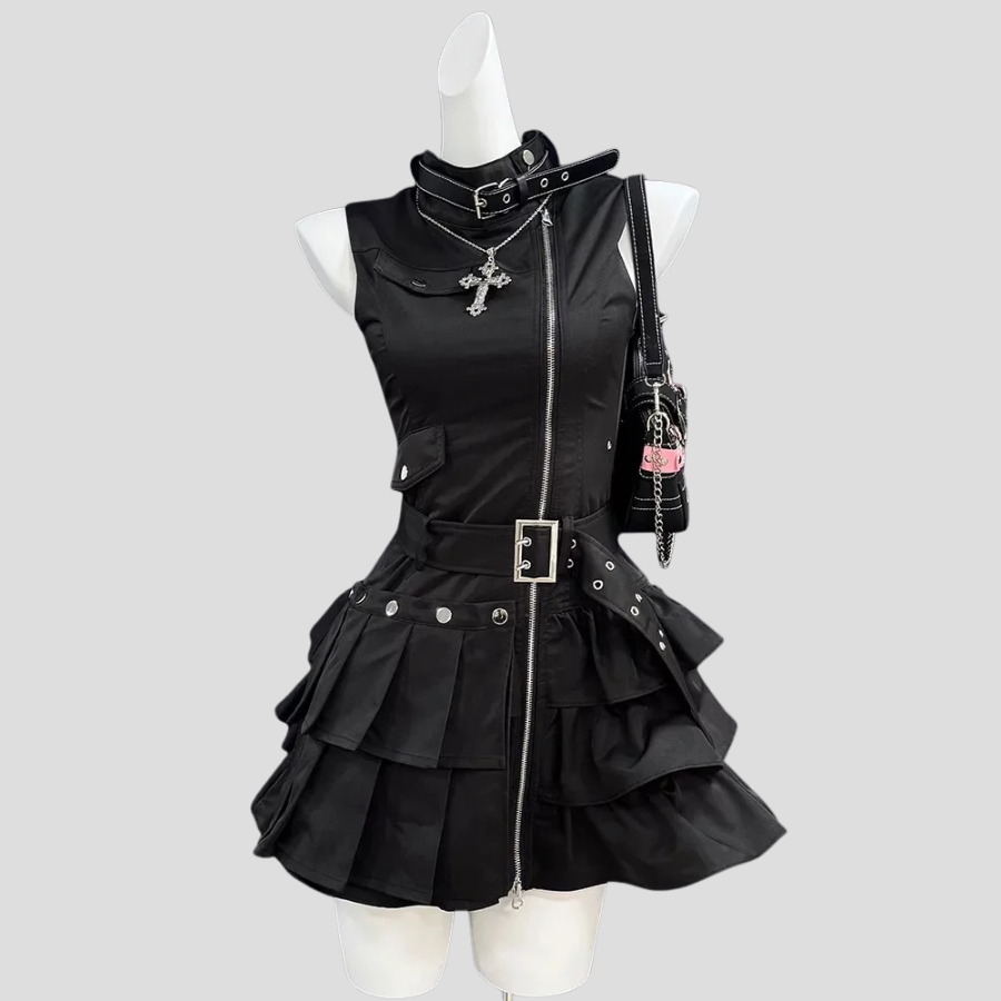 Rochie gotică neagră cu dungi, fermoar și volane pentru femei Vezi opțiunile