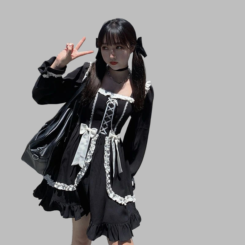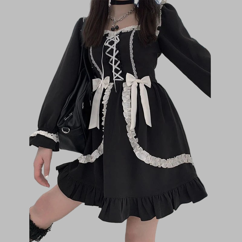 Rochie Jirai Kei neagră cu funde albe și șireturi