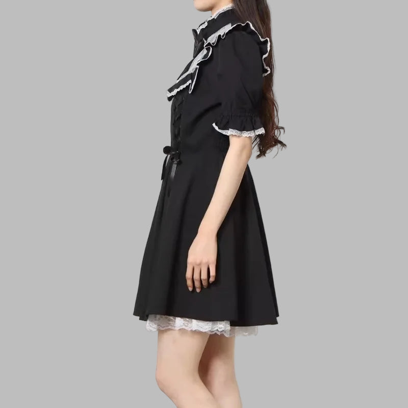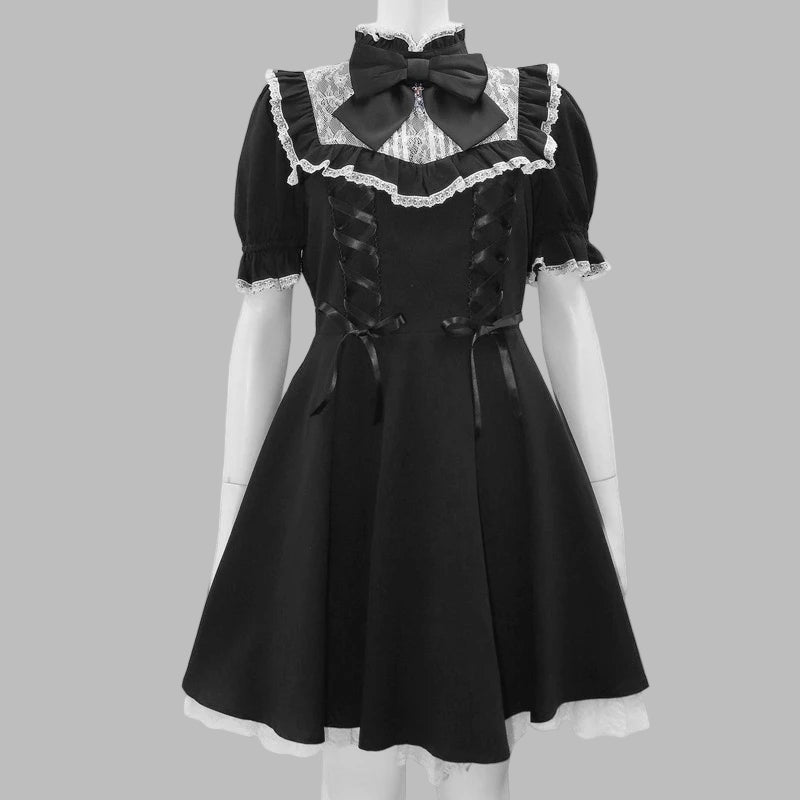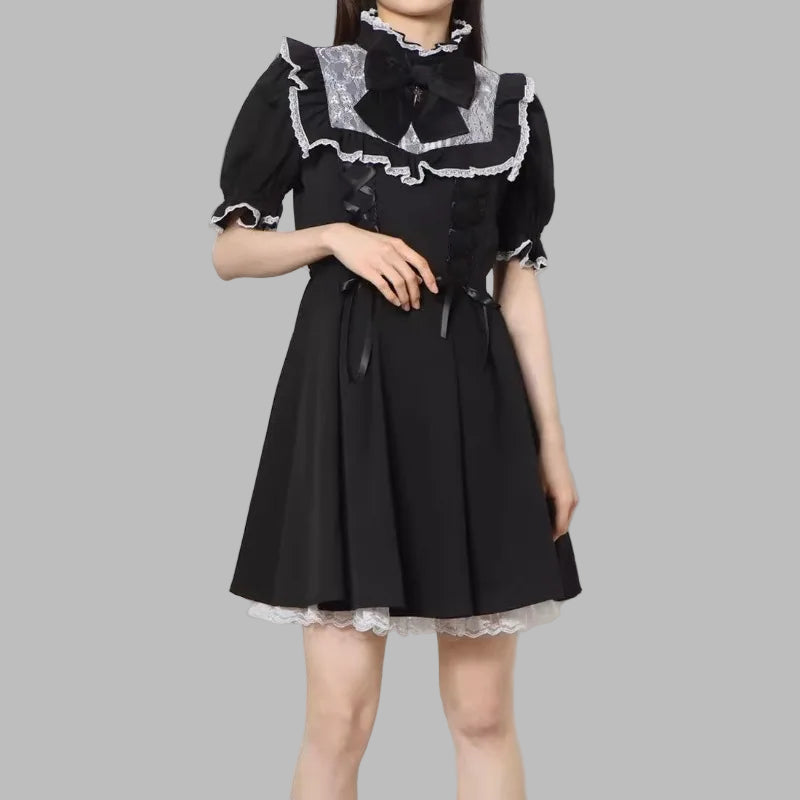 Rochie Jirai Kei neagră cu fundă din dantelă și șireturi
