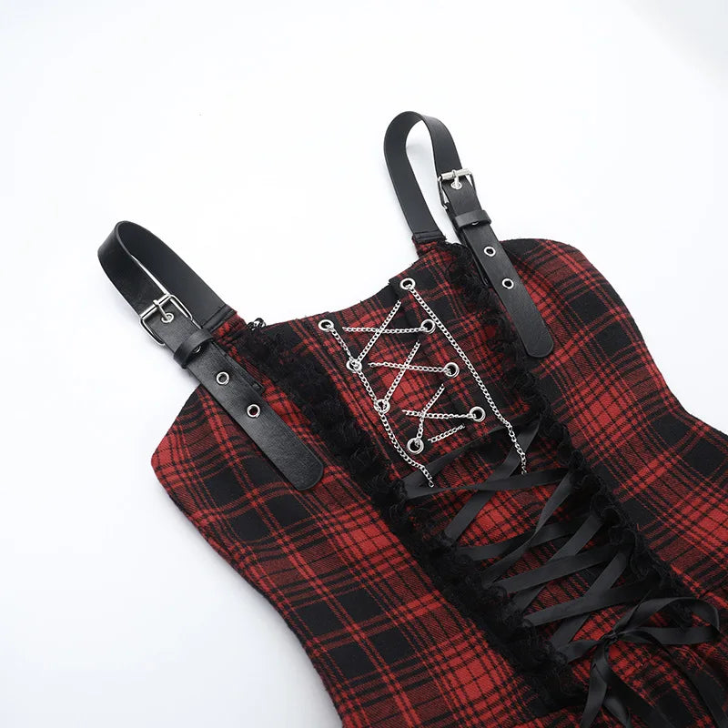 Rochie rock punk roșie cu lanțuri și dantelă, mărimea L