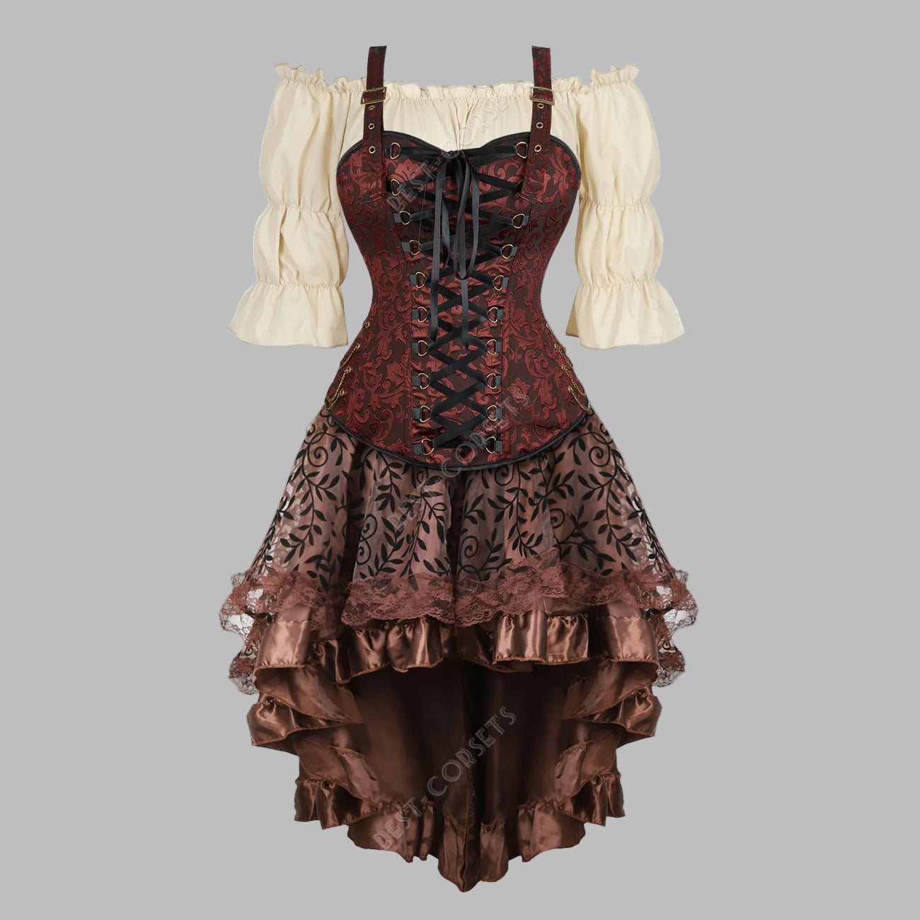 Rochie steampunk cu corset vișiniu cu șiret și dantelă