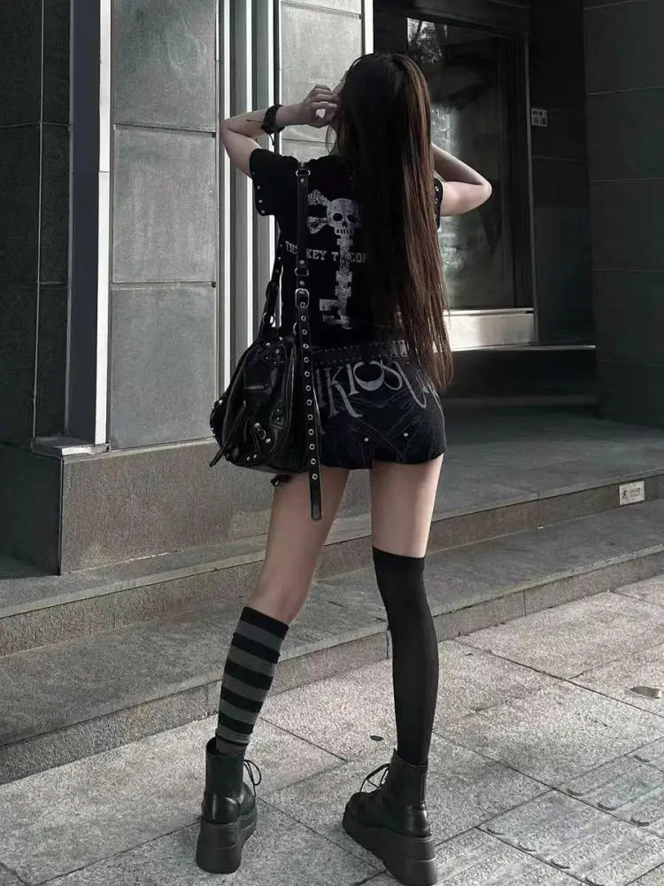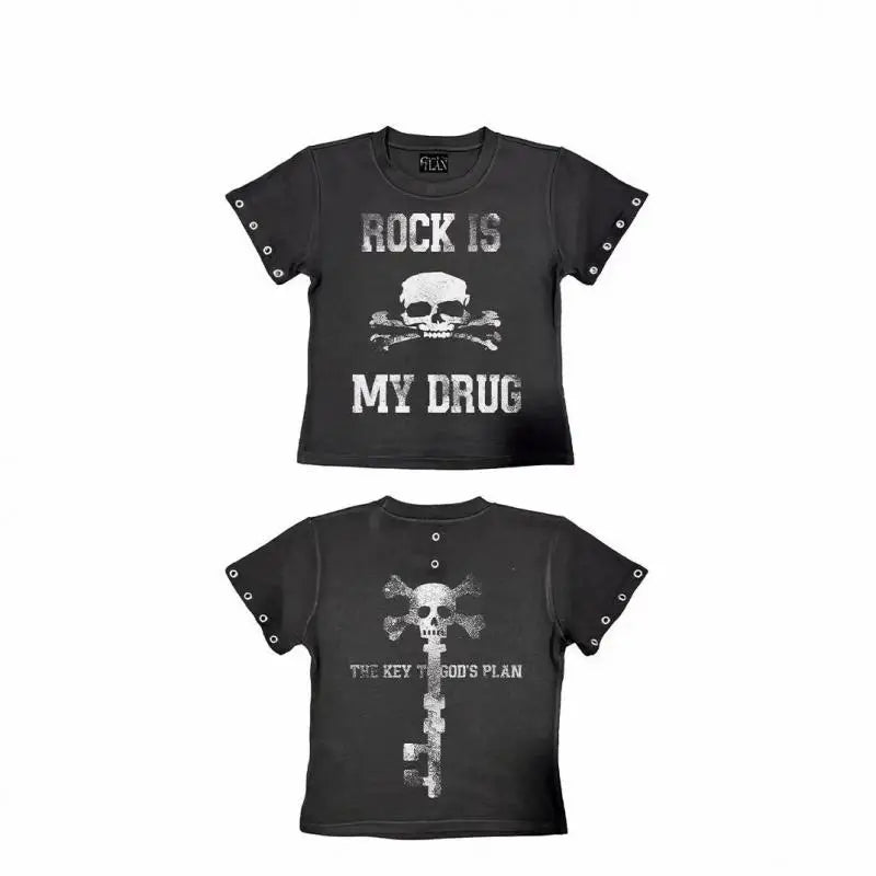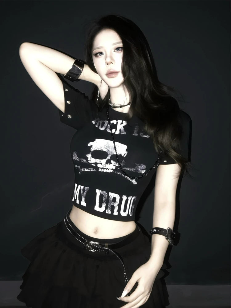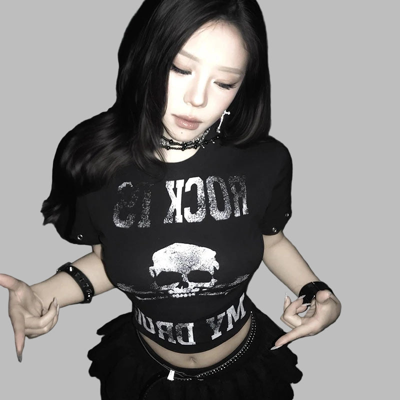 Top scurt cu imprimeu craniu, stil punk metal rock
