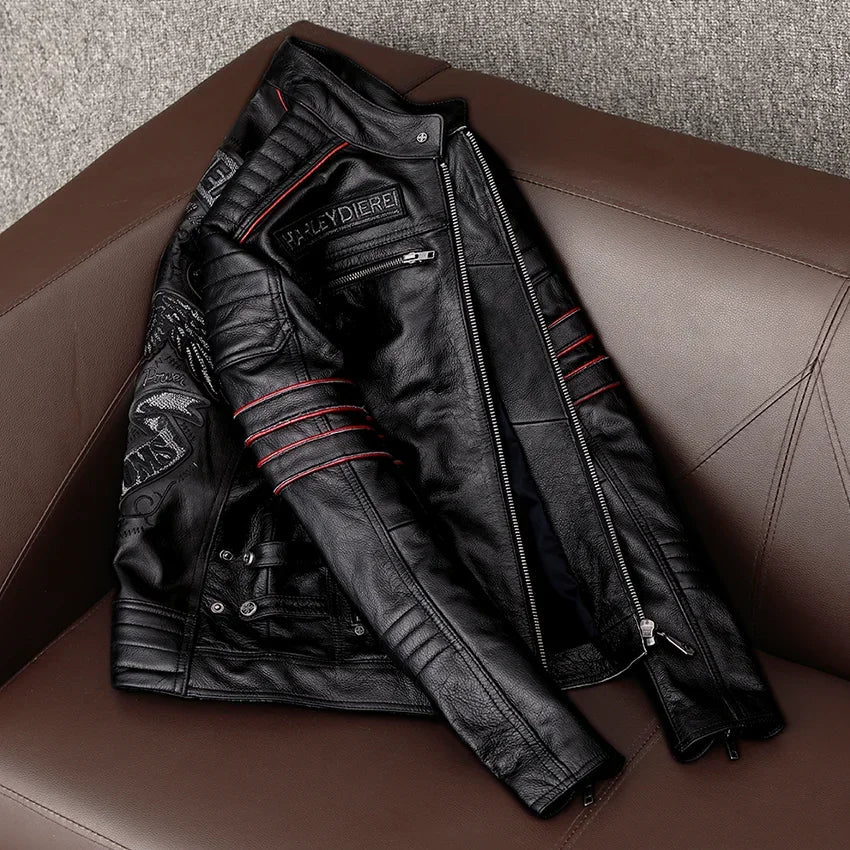 Mizează pe un stil îndrăzneț cu această geacă bărbătească din piele naturală, decorată cu broderii și motiv de craniu. Proiectată pentru călătorii, ieșiri în oraș și pasionații de motociclete, îmbină rezistența, confortul și un caracter inconfundabil. Ideală pentru sezonul de tranziție.